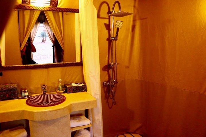 Spend an unforgettable night under the shining stars at the beat of the desert drums in a luxury desert camp (double tent with private shower/toilet)