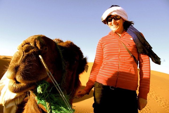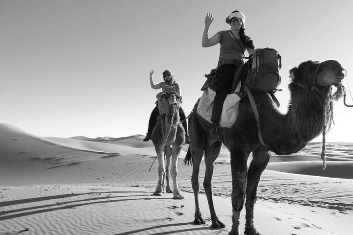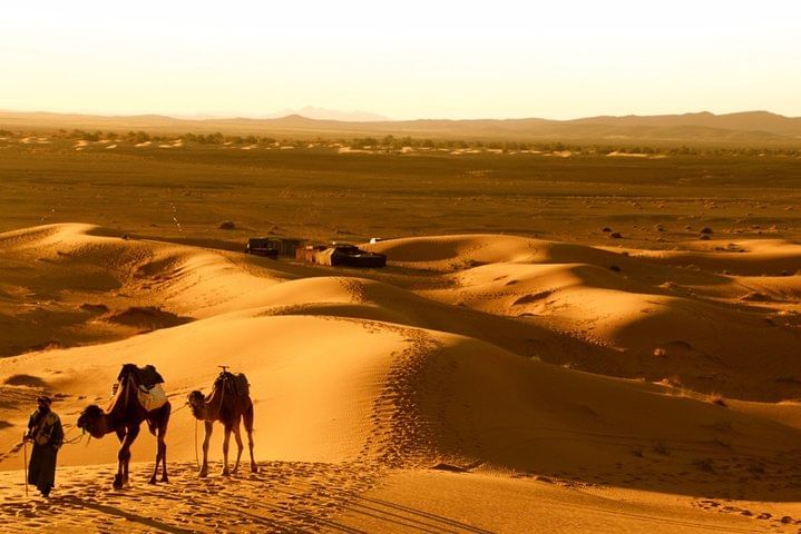 Ride a camel at Sunset through the majestic red sand dunes of Erg Chebbi