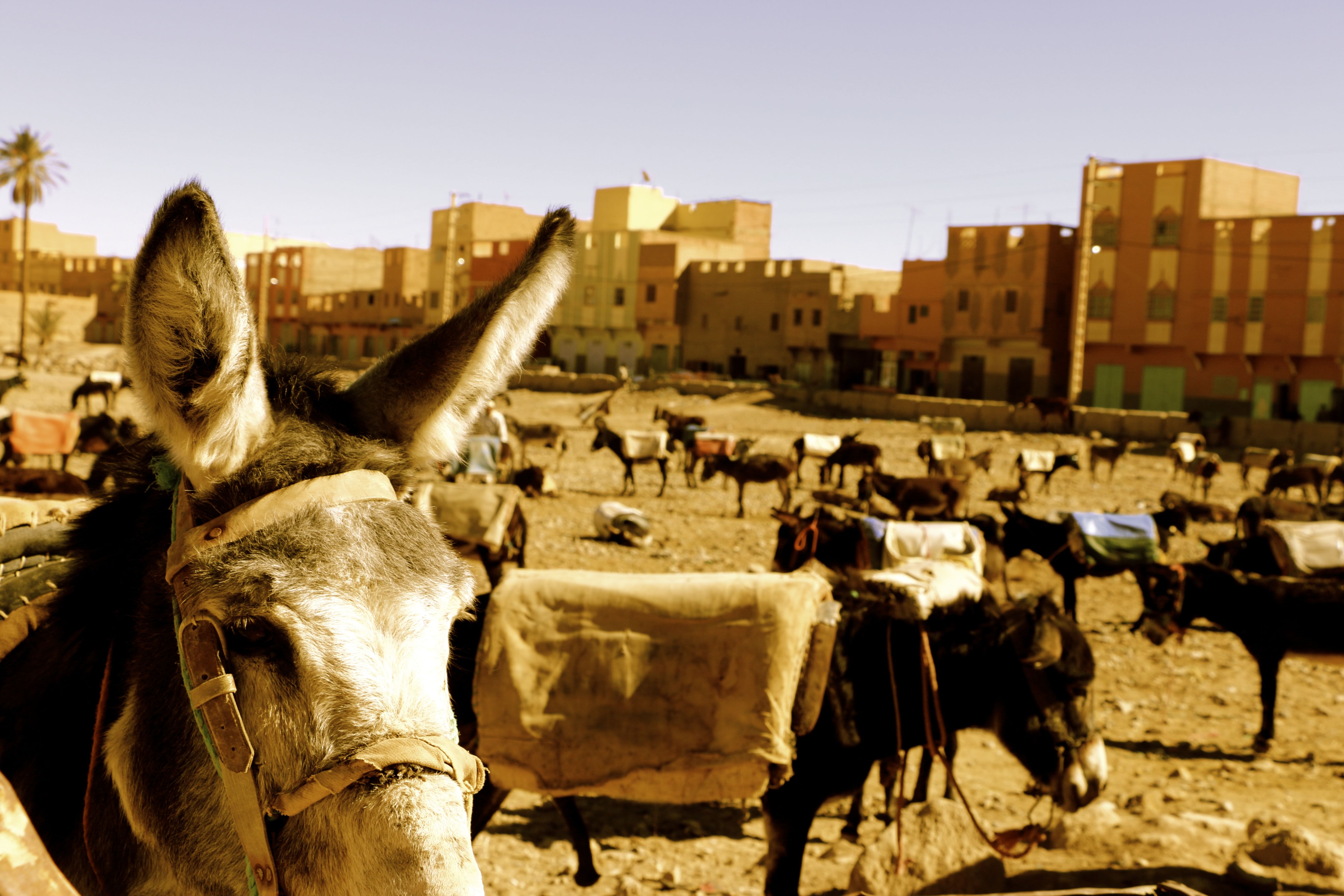 Wake up by the first strays of light to watch the sunrise over the sahara before you enjoy your typical breakfast. If you like, you can catch a board and try some sandboarding after walking up a big dune next to the camp. We return on the camel's back or 4x4 to the desert lodge where a nice shower awaits us. In Rissani we will have the opportunity to visit the local market with the «donkey parking» and have a look at some fossils outside the city.