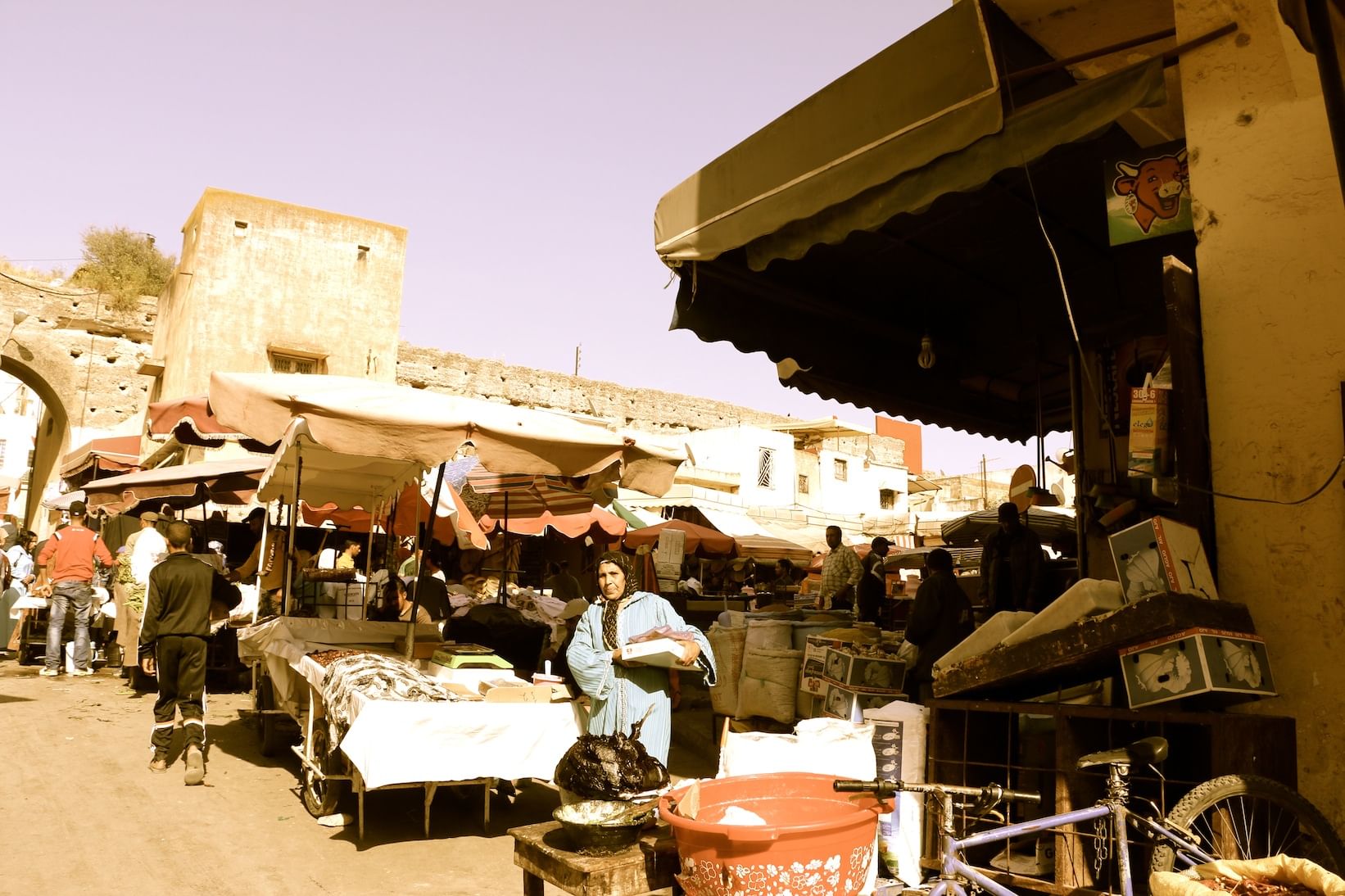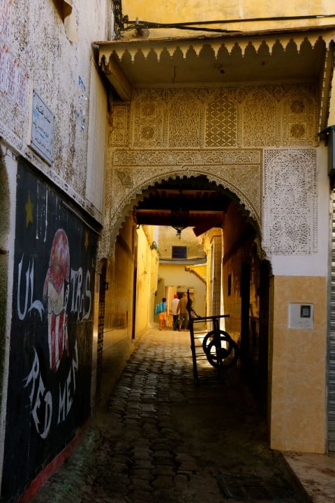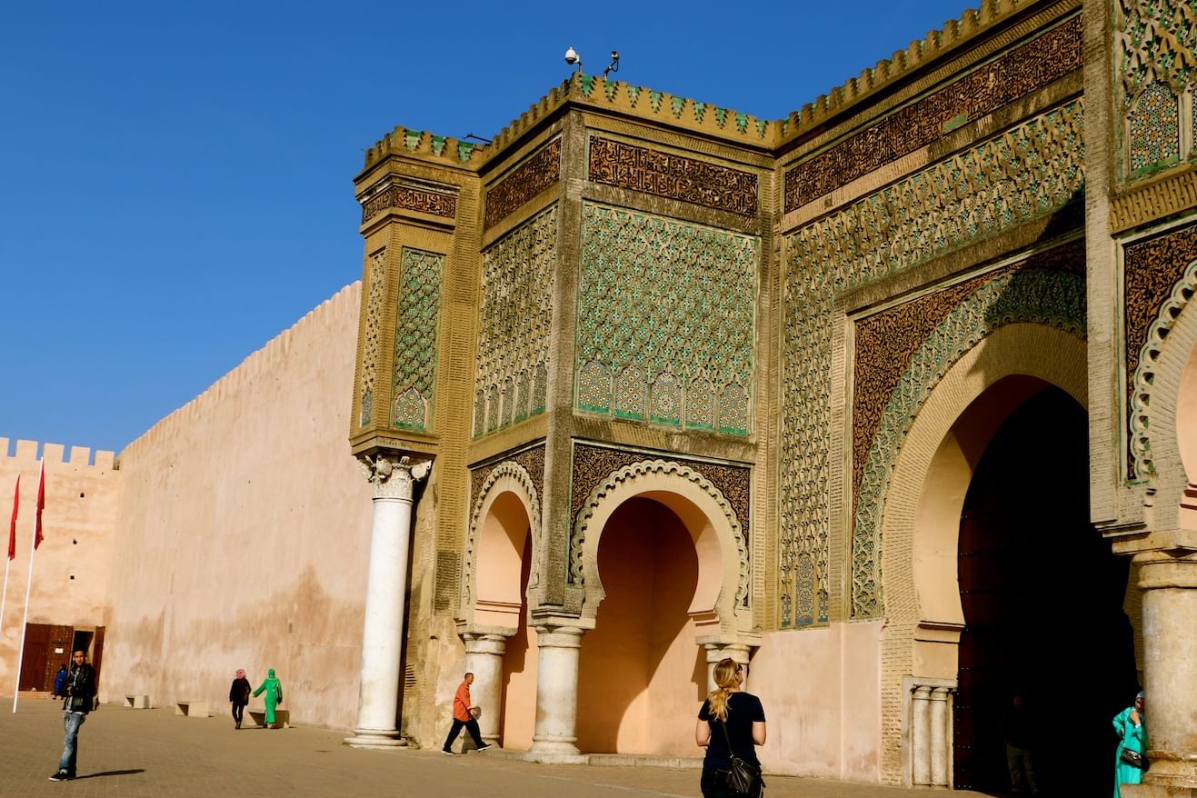 Following Volubilis, head to Meknès for lunch, Morocco's former capital. Next, begin the walking portion of the tour. Admire the spacious souks and the beautiful gate of Bab el-Mansour at the Place el Hedim, and visit the mausoleum of Moulay Ismail.
