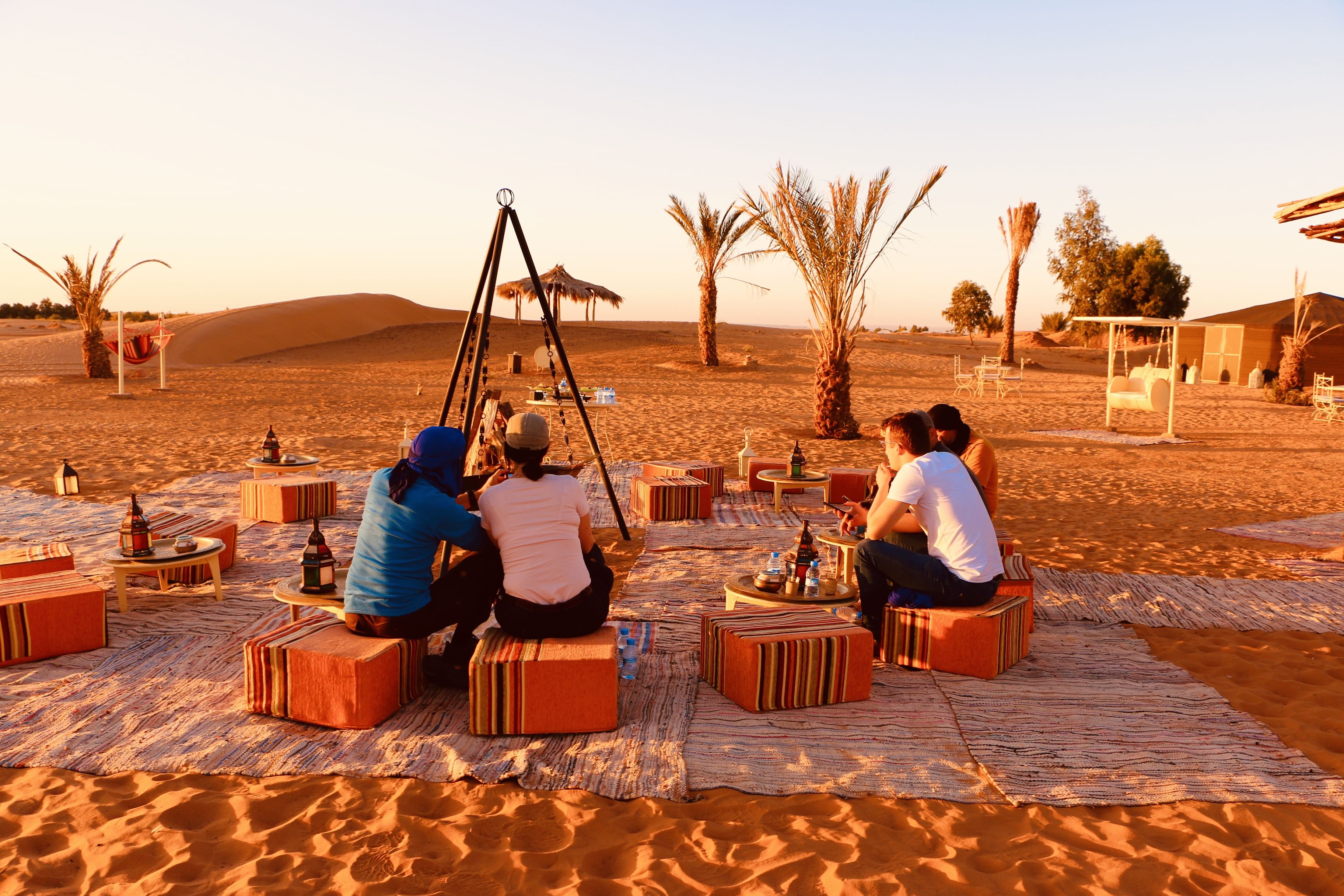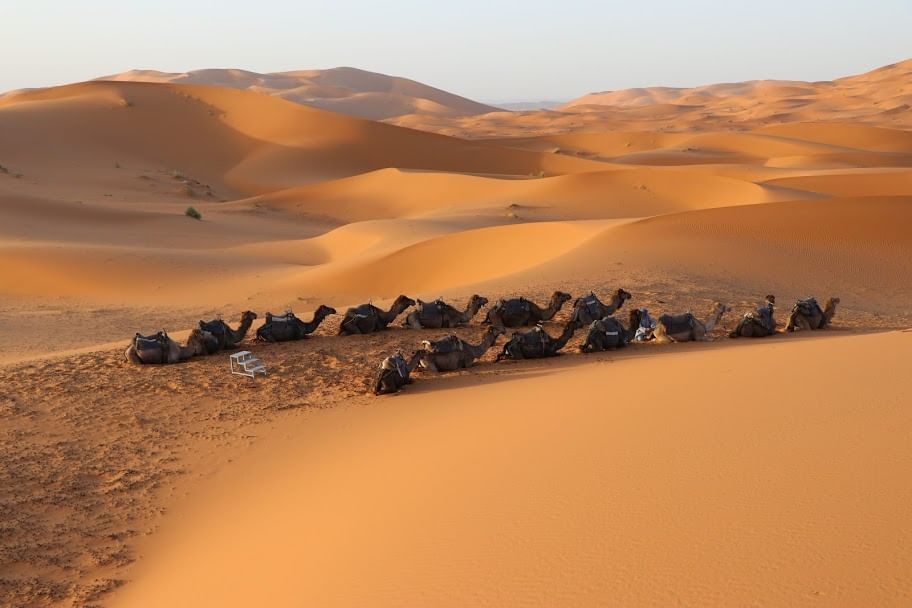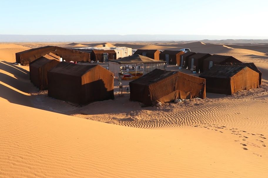 After pick up in your accommodation in Ouarzazate, you can choose your desired activity in the movie city: the Kasbah of Taourirt awaits the photographers, the film studios and the film museum are interesting for adults as well as for your kids. After, we’ll continue our way through the Draa valley in direction desert. We’ll have enough time to visit Zagora and its surroundings like the Jewish quarter in Amzerou and have a look at the huge palm groves. Afterwards, we’ll continue our trip towards the desert to Mhamid. Along the way, we stop at a Saadian town of the 16th century which is called Tamegroute. There, we are able to visit an old coran library and a subterranean Kasbah. Mhamid is the end of the Draa valley as well as the end of civilization. We’ll have our Pic Nic-lunch in the desert and continue direction Erg Chegaga, where we’ll arrive before sunset. Hop on a camel and walk at the desert pace along the dunes with its diverse colors. We’ll arrive at the desert camp where you’ll pass the night in a nomad tent or under the shining stars in the middle of impressive sand dunes. A traditional dinner is served and you can spend the night watching for shooting stars or dance around the camp fire to the beat of the desert drums.