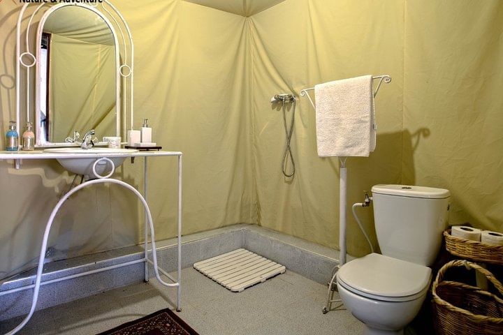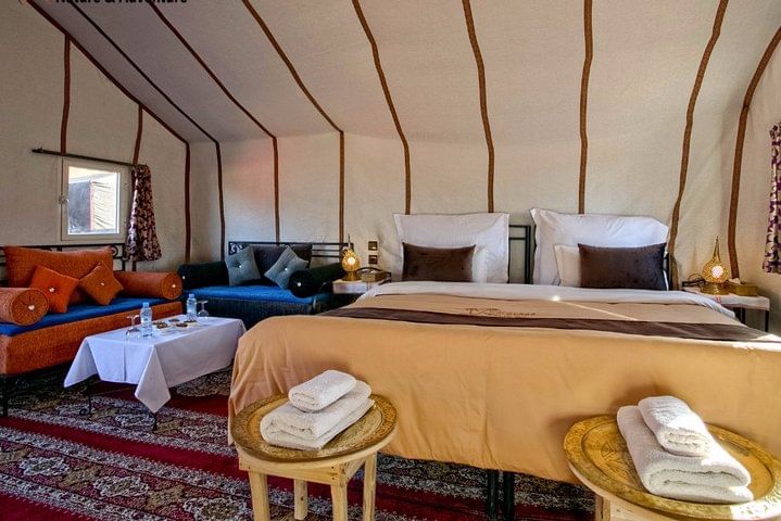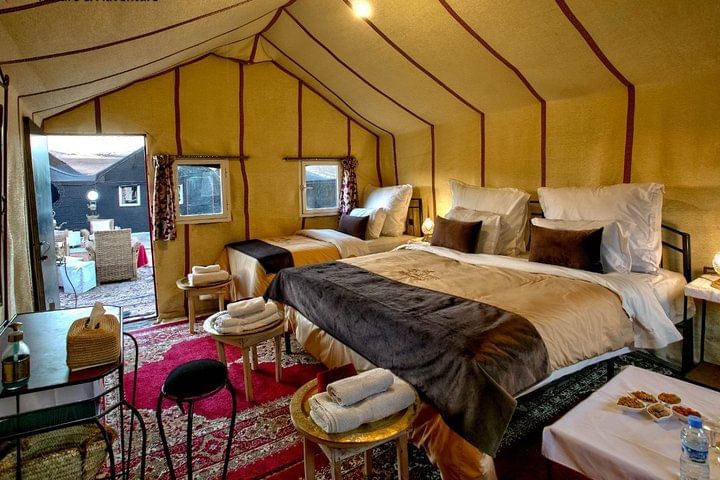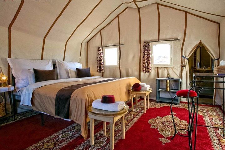 Spend an unforgettable night under the shining stars at the beat of the desert drums in a luxury desert camp (double tent with private shower/toilet)